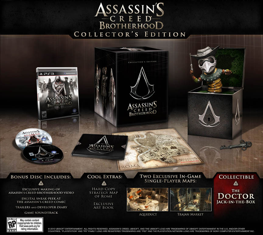 Ubisoft hat heute die Limited Edition zu Assassin's Creed: Brotherhood für die US-Käufer enthüllt. Sie enthält neben dem Spiel eine Bonusdisk, auf welcher unteranderm der Soundtrack und ein Making of-Video zu sehen sind. Zusätzlich enthält die Special Edition eine Karte von Rom, ein Artbook und zwei neue Karten für den Singleplayer-Modus.